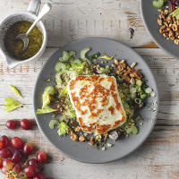 Serve the halloumi steaks over the bulgur and drizzle the Dijon dressing over