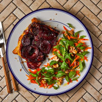 5. Once the onions and beetrootare done, add them to the caramelwith the chopped thyme leaves and mix until evenly coated – this is your tart mix