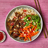 Serve the basmati rice topped with the Vietnamese-style pulled mushrooms, shredded lettuce and carrot matchsticks